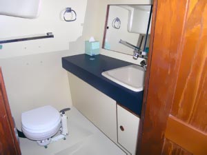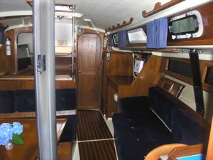 Looking aft on the port side showing the head door and aft cabin door to the left of the mast.