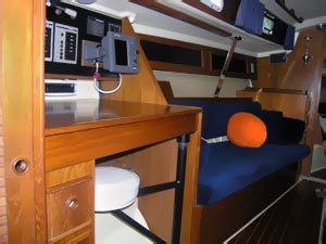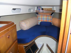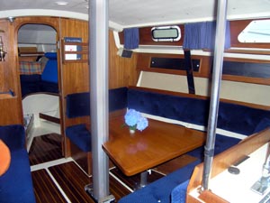 Looking forward toward the starboard side, showing the drop down table that convets to a bearth.